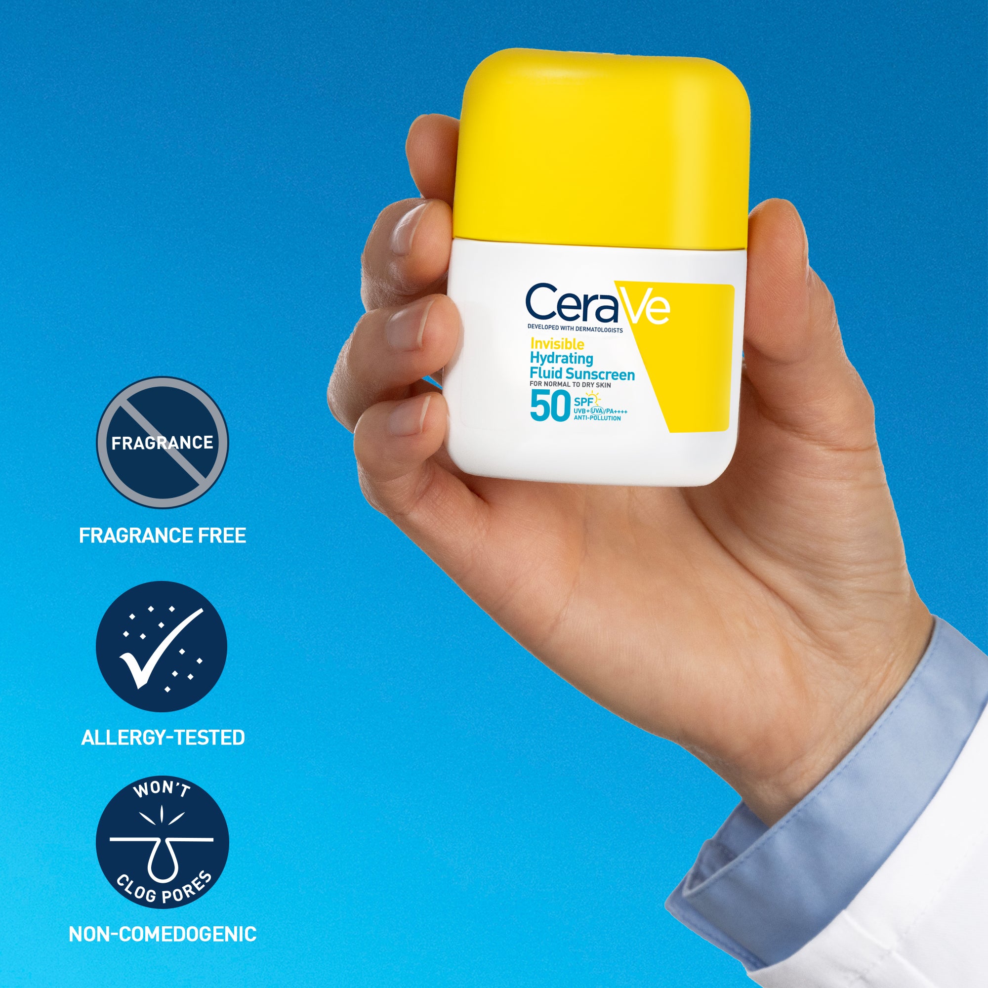 Caractéristiques : Le Fluide Hydratant Invisible SPF50 CeraVe est une protection solaire haute performance spécialement conçue pour les peaux normales à sèches, même sensibles. Sa formule légère au fini invisible hydrate pendant 24 heures grâce à la Technologie MVE, tout en bloquant les rayons UVA, UVB et UVA longs. Enrichi aux 3 céramides essentiels et à la vitamine E antioxydante, il prévient le photovieillissement, les taches brunes et protège de la pollution. Testé sous contrôle ophtalmologique. Sans traces blanches sur toutes les carnations. Sans parfum. Sans alcool.