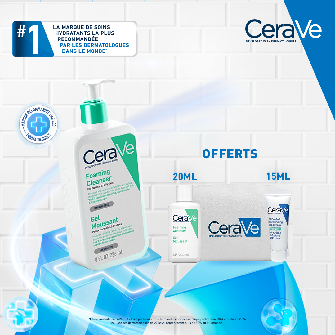 Cerave gel moussant nettoyant peau normale à grasse 473ml = Gel moussant 20ML + gel creme hydratant 15ml + Trousse OFFERTS