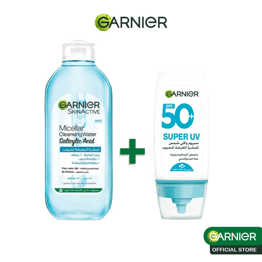 GARNIER Solution Micellaire ANTI ACNE 400ml + Super UV Serum Sunscreen SPF50+ PA++++ – Peaux à Imperfections & Anti-Acné