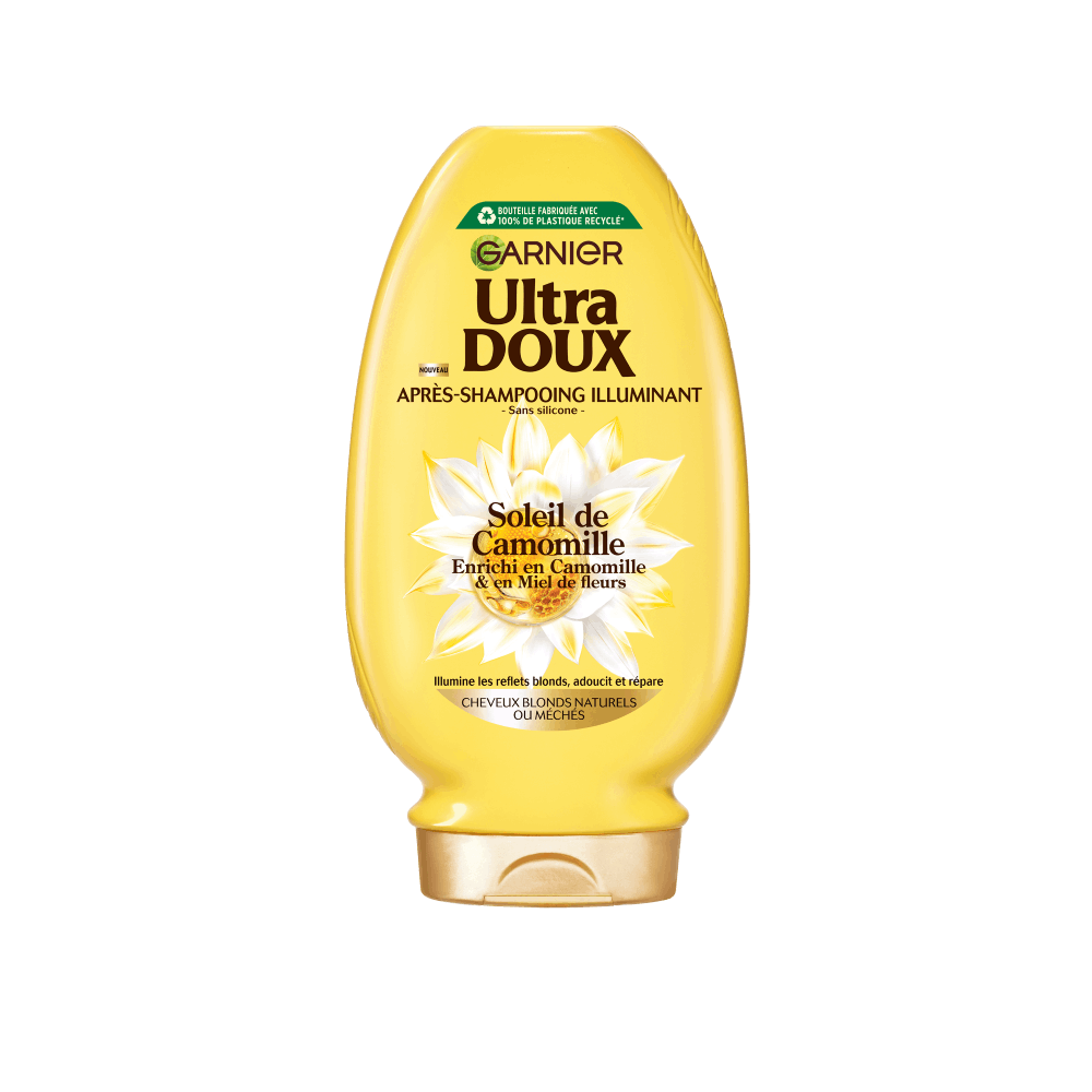 L'après-shampooing Garnier Ultra Doux Camomille Ensoleillée & Miel de fleurs démêle, apporte de la brillance, illumine, adoucit et répare les cheveux. Découvrez le pouvoir Adoucissant de la Camomille et l'action Nourrissante du Miel de Fleurs combinés dans une formule illuminatrice et brillance qui démêle, répare* les fibres capillaires endommagées, adoucit et révèle des cheveux blonds radieux. Pour des cheveux blonds radieux de santé avec des reflets naturels. La formule convient à tous les types de blonds : naturels, méchés et sensibles. Garnier s'engage pour une beauté durable. Pour encore plus de soins, découvrez la routine complète.