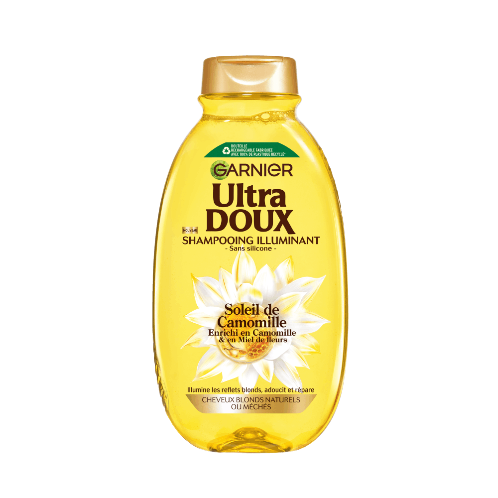 Véritable recette de lumière pour les cheveux blonds, Ultra Doux Soleil de Camomille associe dans sa gamme deux ingrédients aux propriétés remarquables : la Camomille reconnue pour son pouvoir illuminant et le Miel de Fleurs réputé pour ses vertus réparatrices.