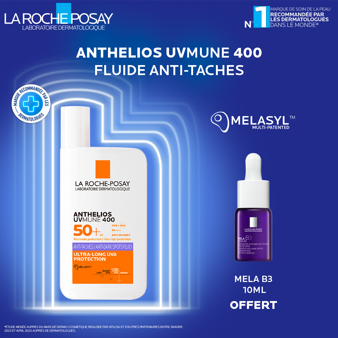 Utilisation : Appliquez Anthelios UVMUNE 400 Anti-Taches chaque matin. Pour une routine complète, utilisez le Gel Nettoyant MELA B3, le Sérum MELA B3, puis Anthelios UVMUNE 400 Anti-Taches.