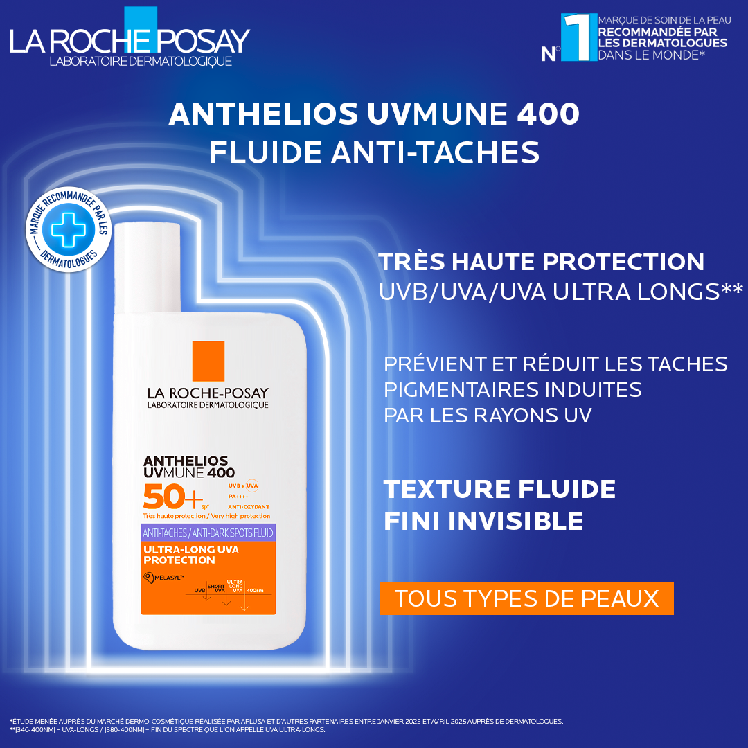 Anthelios UVMUNE 400 Fluide Anti-Taches SPF 50+ est un écran solaire haute protection qui aide à prévenir et à réduire les taches pigmentaires causées par les rayons UV.