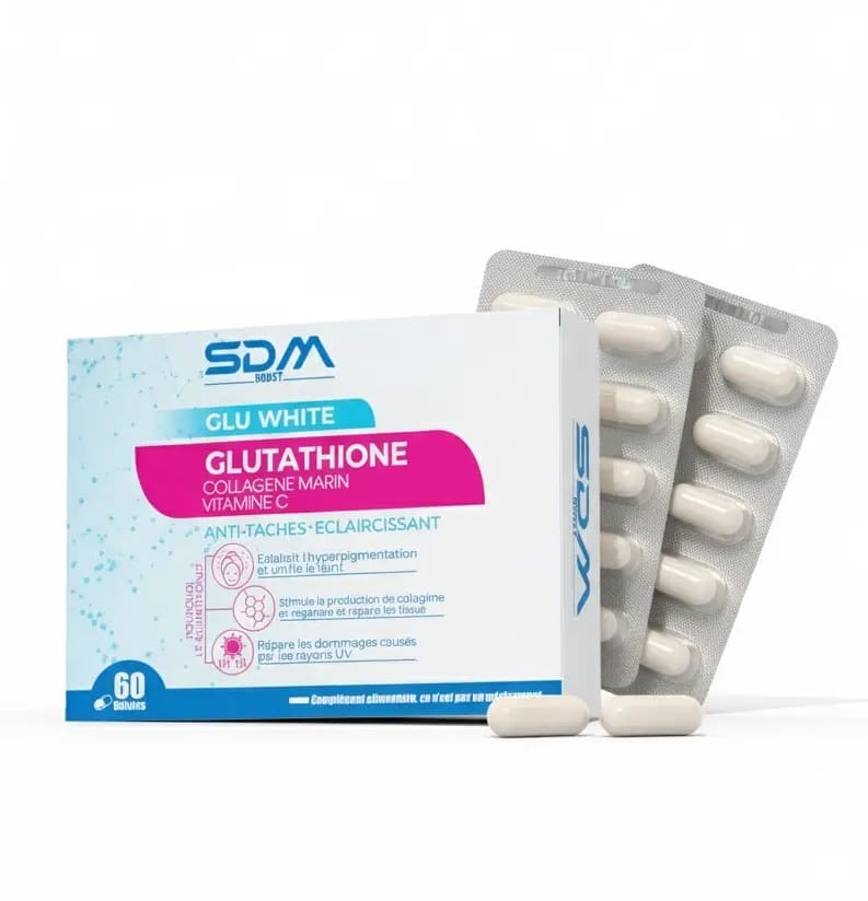 Le SDM Boost Glu White est un complément alimentaire innovant formulé pour éclaircir le teint, réduire les taches pigmentaires et renforcer l’élasticité de la peau grâce à la synergie de trois actifs puissants : glutathione, collagène marin et vitamine C.