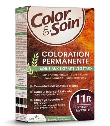 La Color & Soin Coloration Permanente 11R Rouge Myrtille offre une couleur intense, lumineuse et longue durée tout en respectant la fibre capillaire. Formulée sans ammoniaque, sans résorcine et sans parabènes, elle est enrichie en extraits végétaux pour colorer les cheveux en douceur. Une coloration idéale pour les cuirs chevelus sensibles, très recherchée en parapharmacie maroc.
