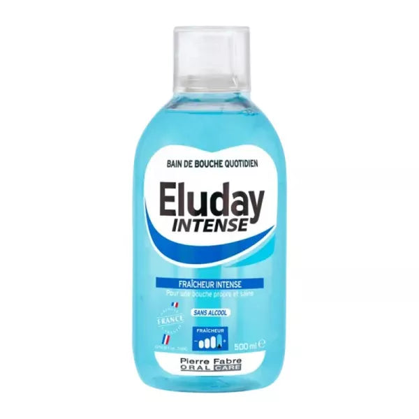 - ELUDAY INTENSE est un bain de bouche à usage quotidien à utiliser après chaque brossage pour une fraîcheur intense en longue-durée et une bouche saine.