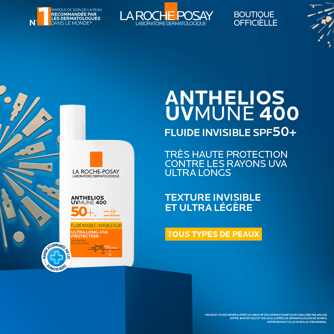 Le fluide solaire SPF 50+ Anthelios UVMune 400 est une innovation des laboratoires La Roche-Posay. Il convient aux peaux sensibles et offre une très haute protection contre les rayons UV.ce fluide solaire La Roche-Posay est particulièrement adapté aux personnes ayant la peau normale à mixte, avec une tendance aux brillances durant la journée.
