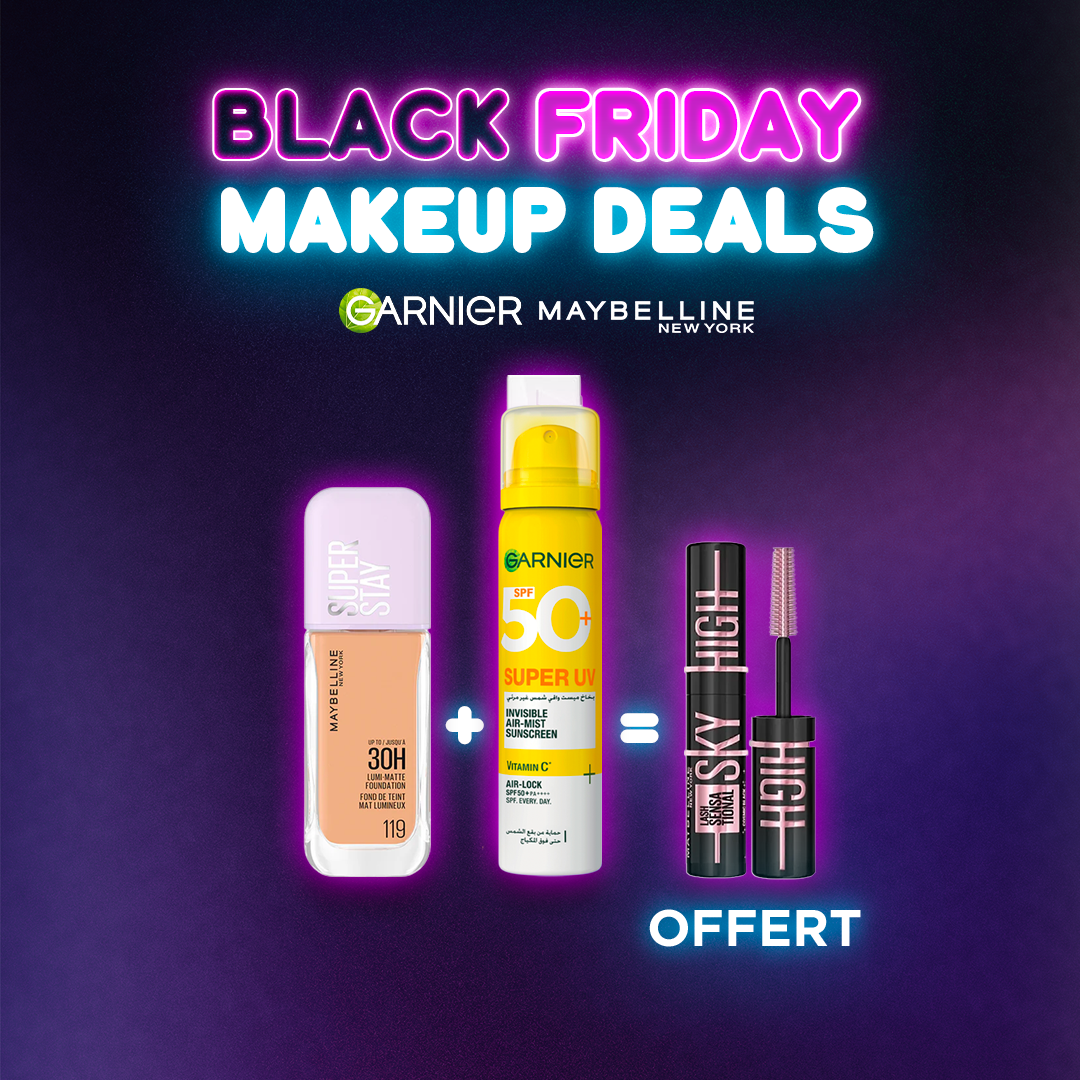Maybelline SUPERSTAY LUMI MATTE FOND DE TEINT + garnier super uv Spray = mini mascara offerte