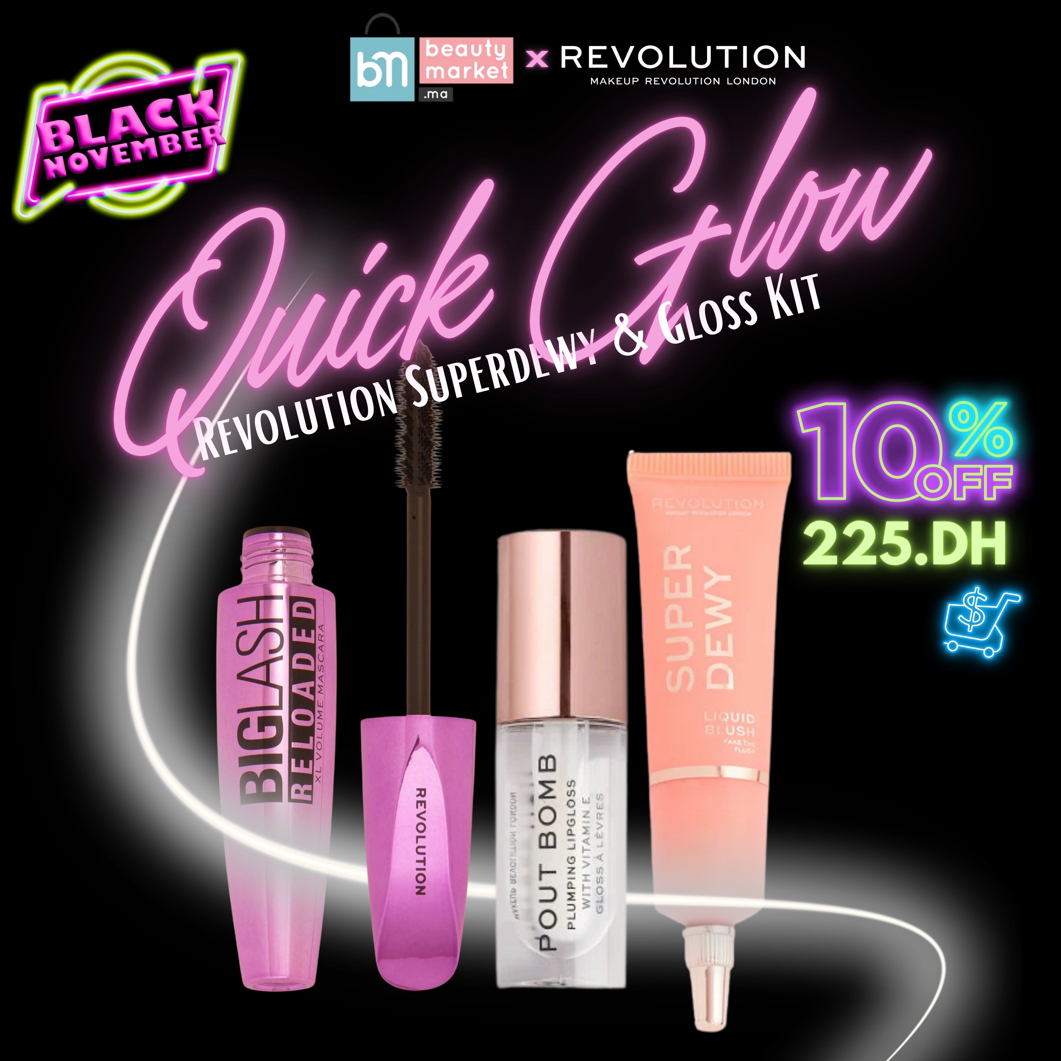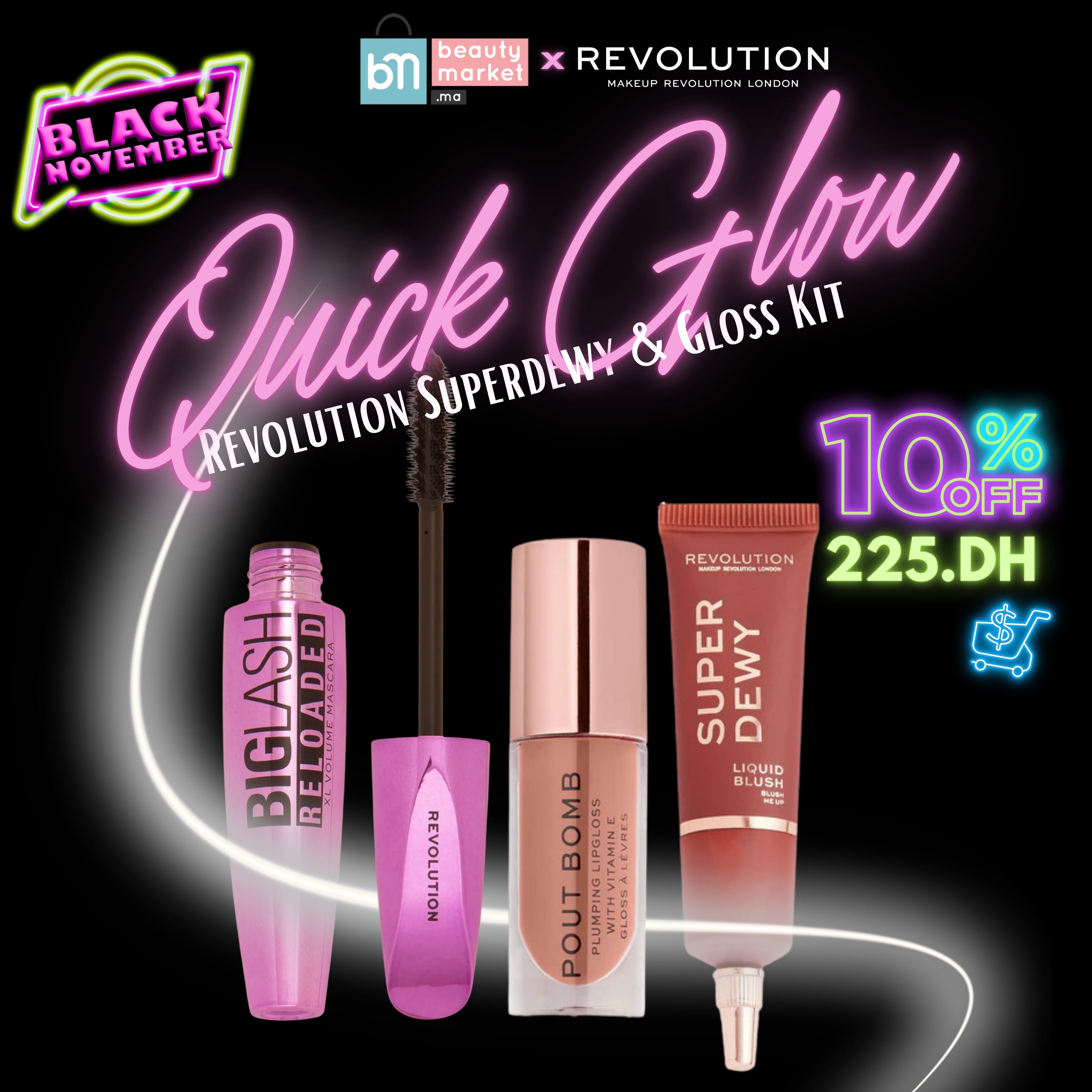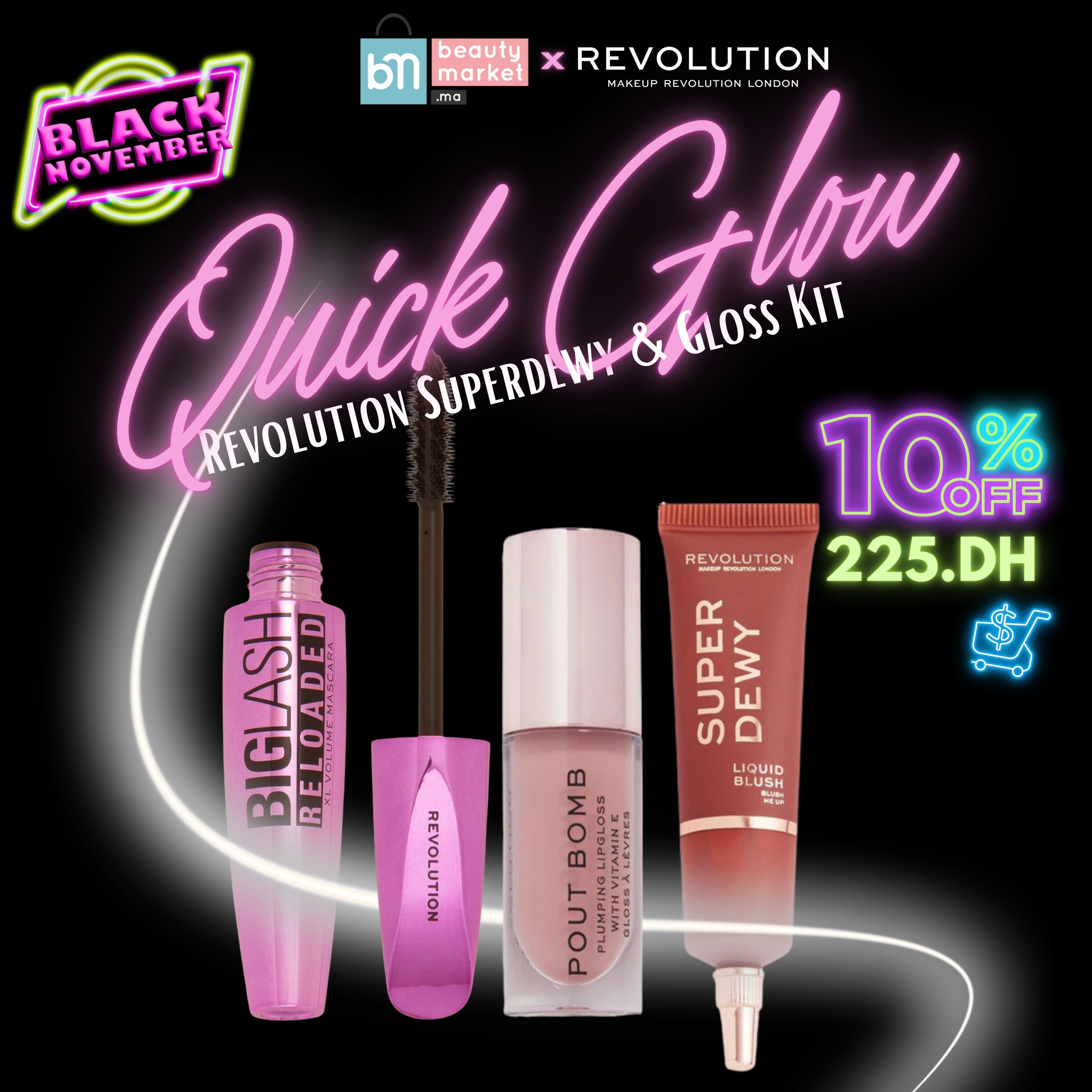 Obtenez un teint lumineux et un regard intense avec le Quick Glow Kit de Revolution Maroc. Ce coffret réunit trois indispensables pour un look glowy, naturel et éclatant : un blush liquide Superdewy, un gloss repulpant Pout Bomb et un mascara volumisant Big Lash Reloaded. L’alliance parfaite entre fraîcheur, éclat et intensité.
